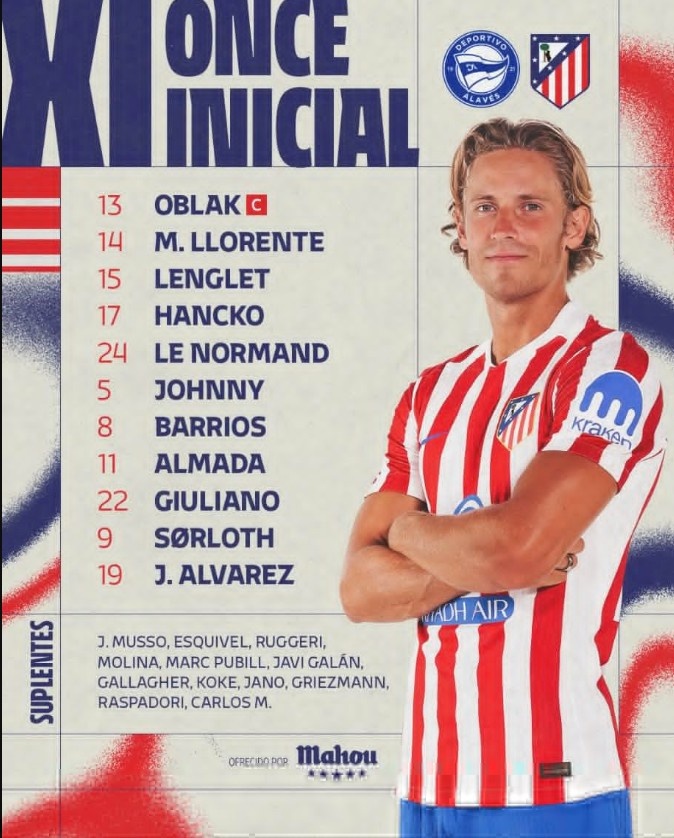 8月30日讯 西甲第三轮比赛,马竞前往客场挑战阿拉维斯。目前,床单军团的首发已经出炉,阿尔瓦雷斯领衔,朱利亚诺-西蒙尼、阿尔马达在列。